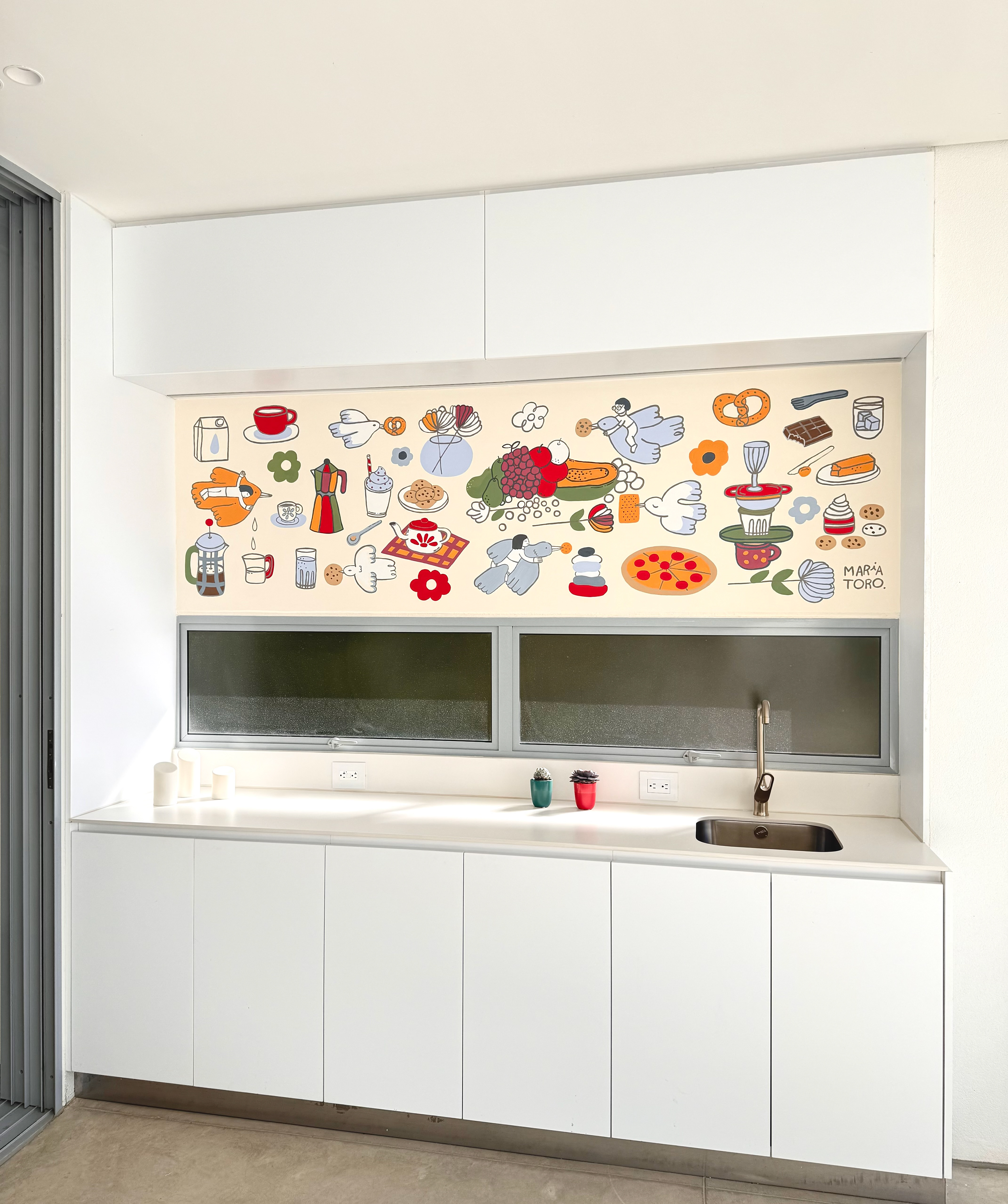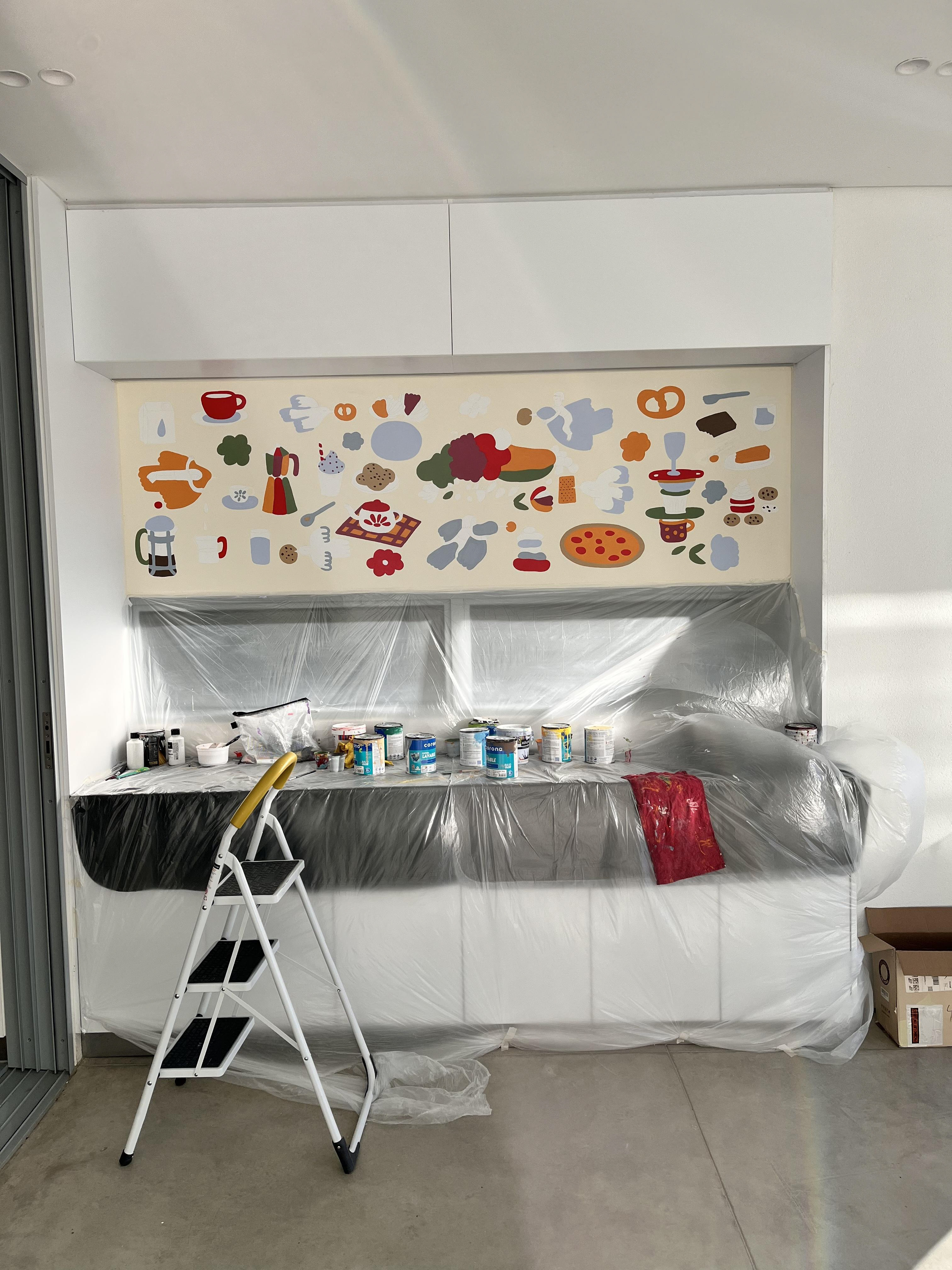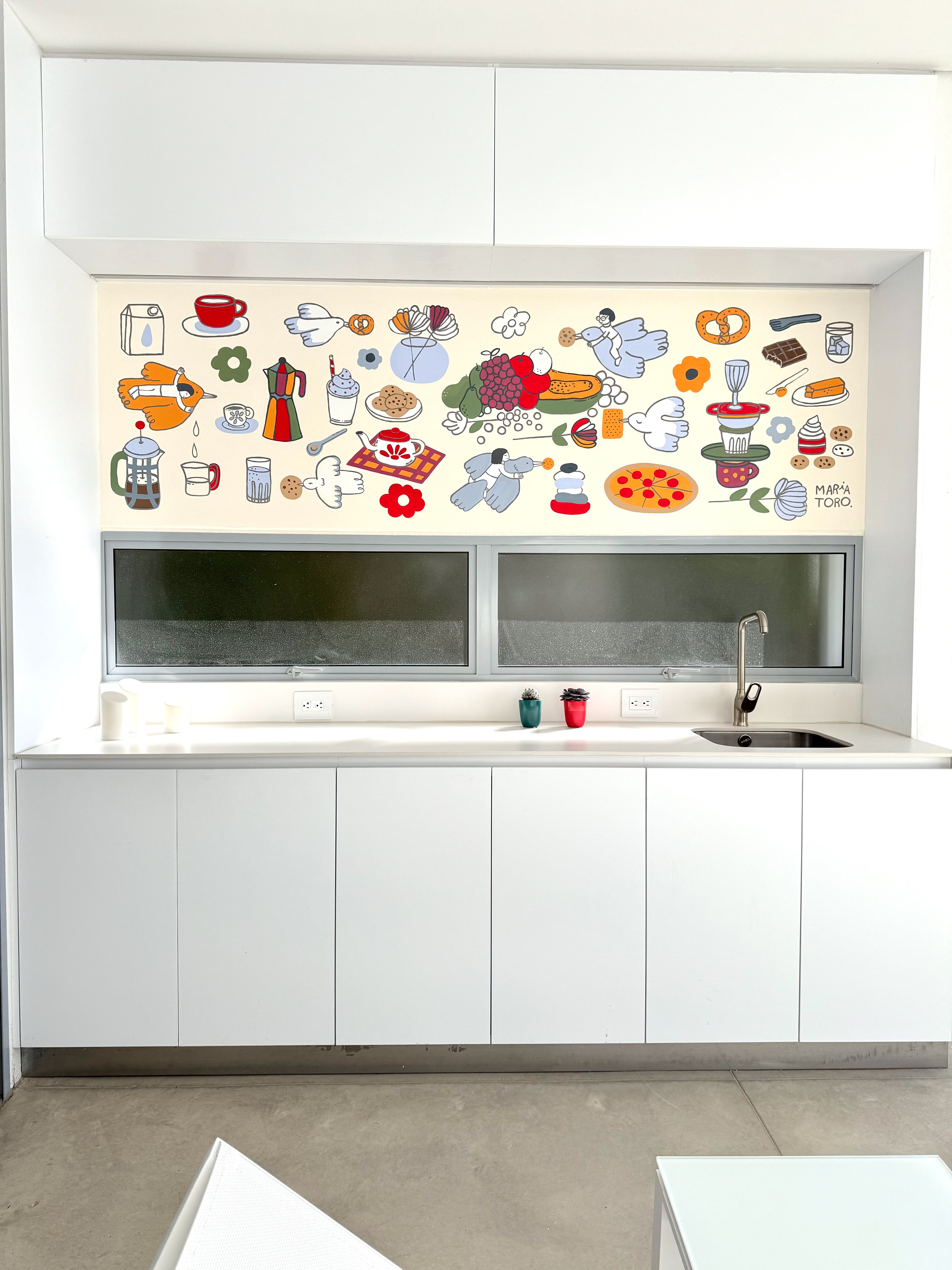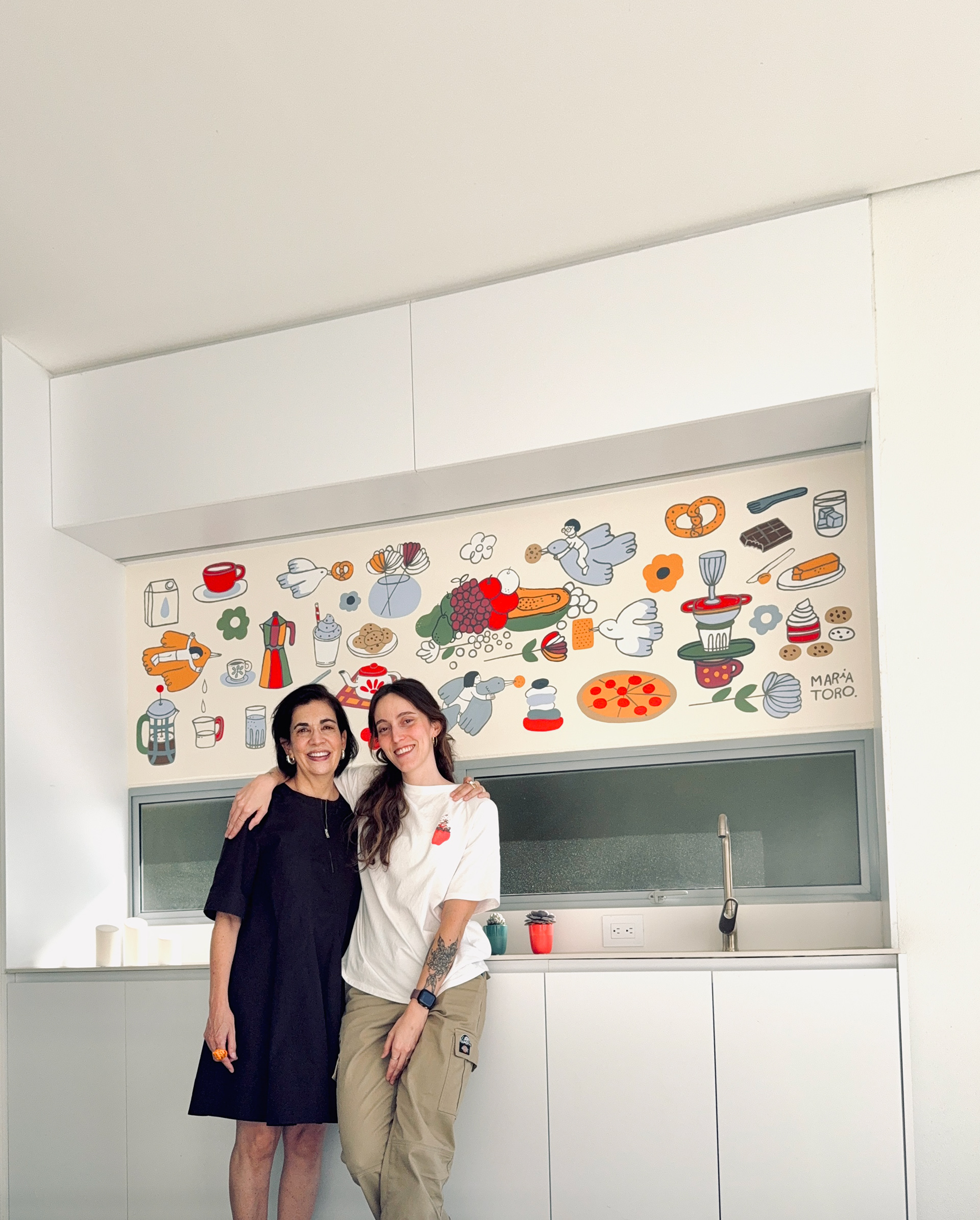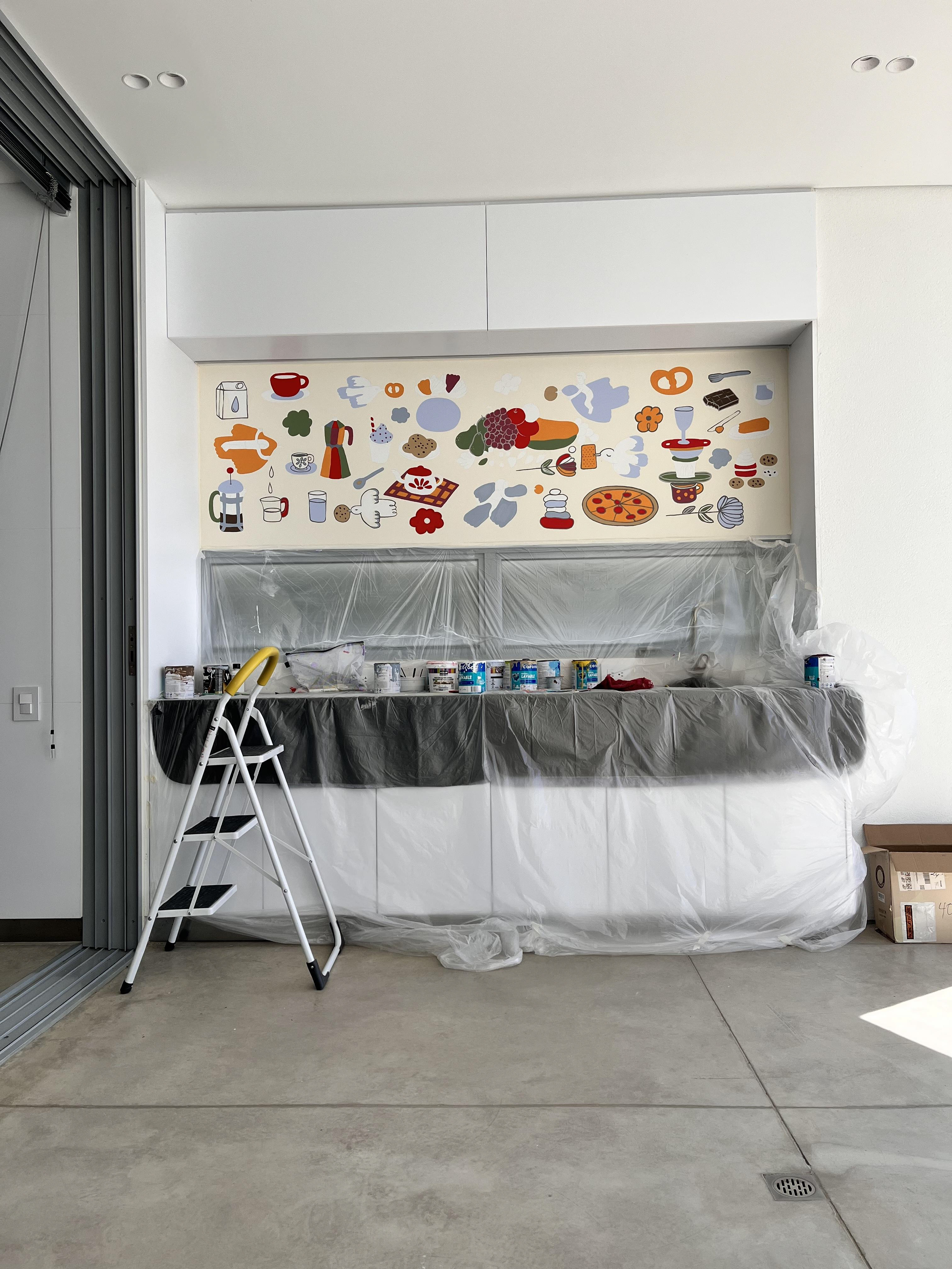 Colombian painter Beatriz Olano’s work is defined by her use of geometry, color, and line, exploring the relationship between objects and space with a distinctly architectural feel. Beatriz and I have shared a friendship and mutual admiration for several years. When she finished her studio, she invited me to be part of it and asked me to create a mural inspired by what she and her husband love most—their favorite moments, foods, and everyday joys. This project has been one of the most rewarding experiences of my life. Thank you, Beatriz!