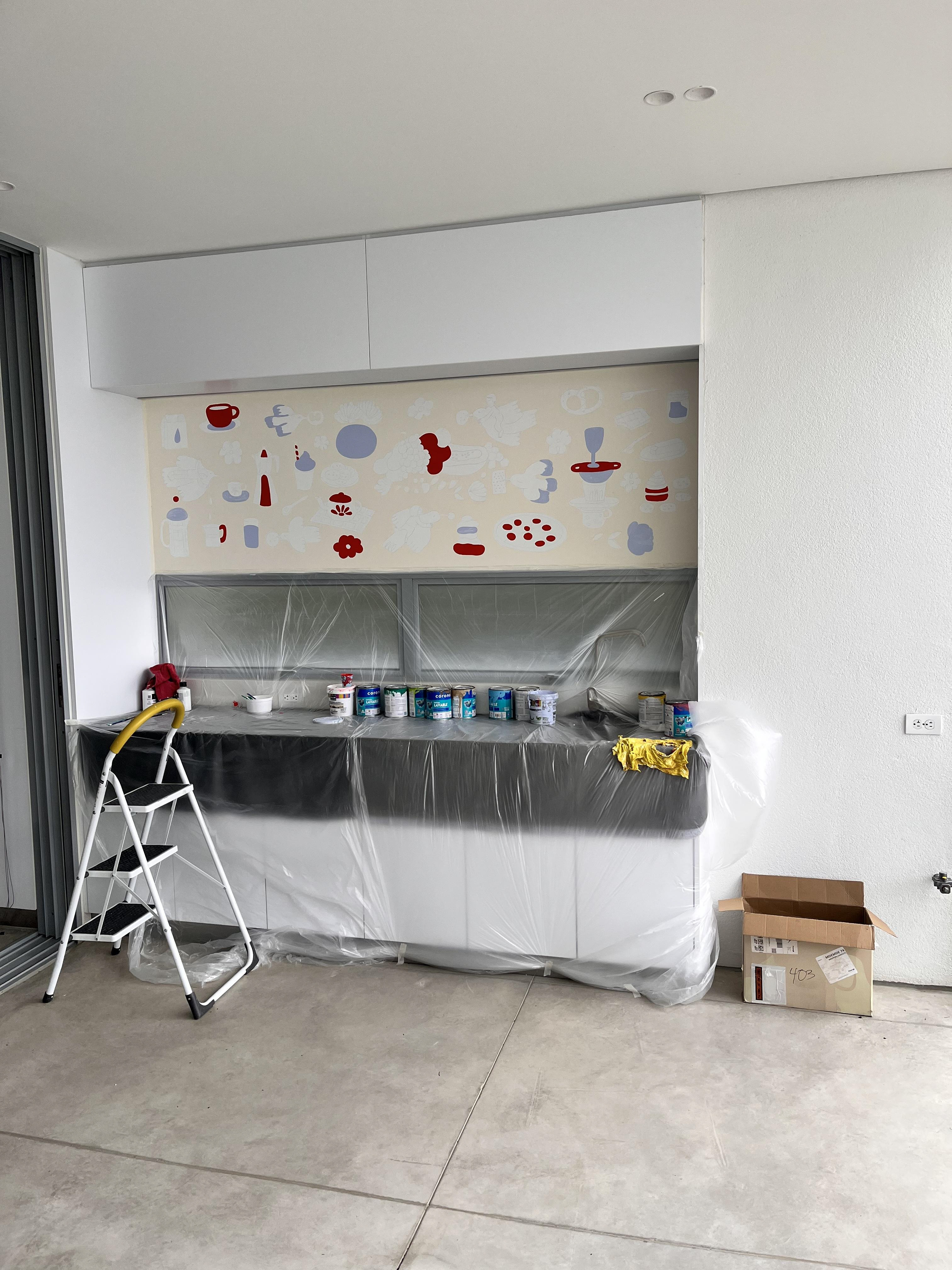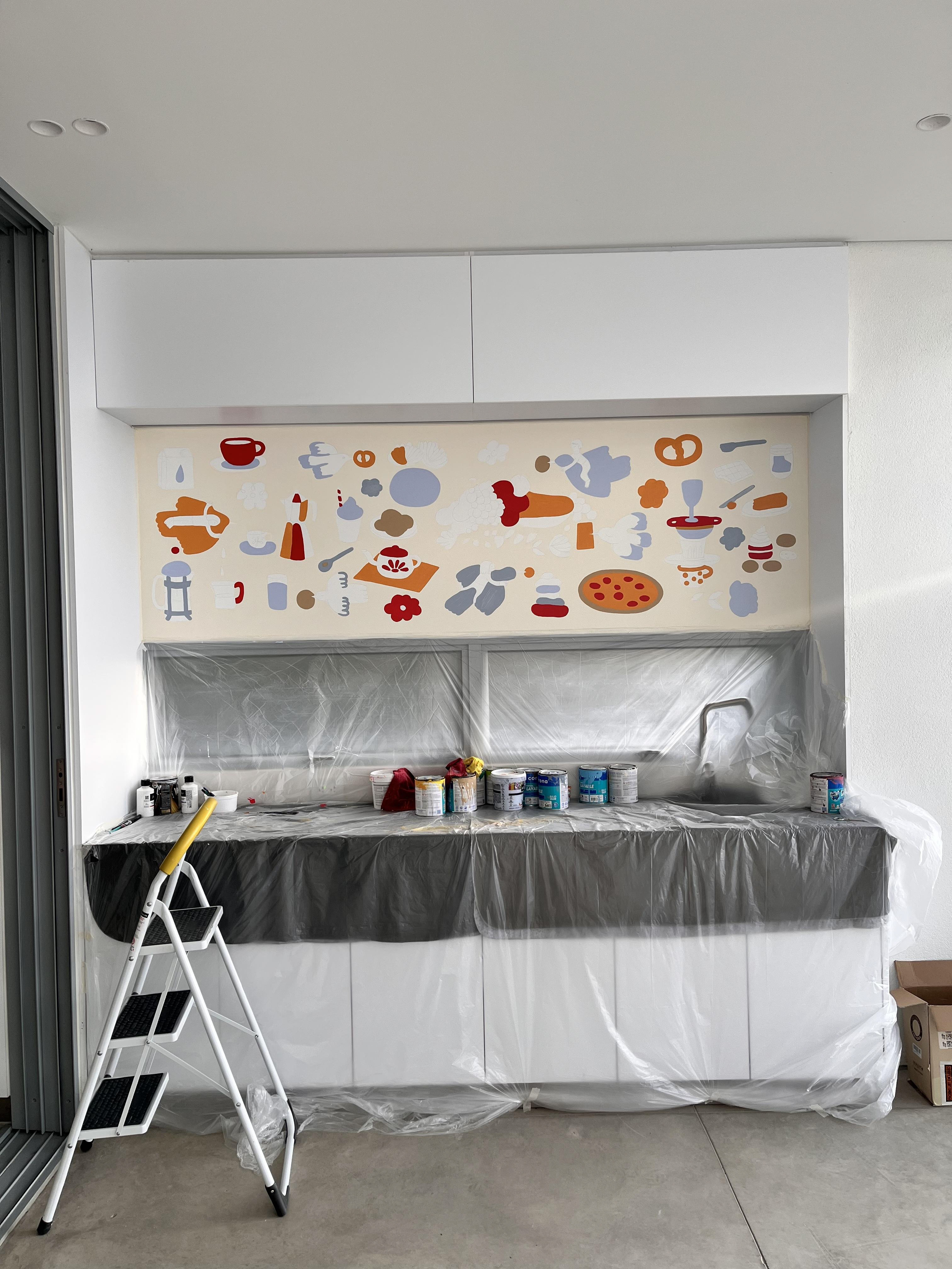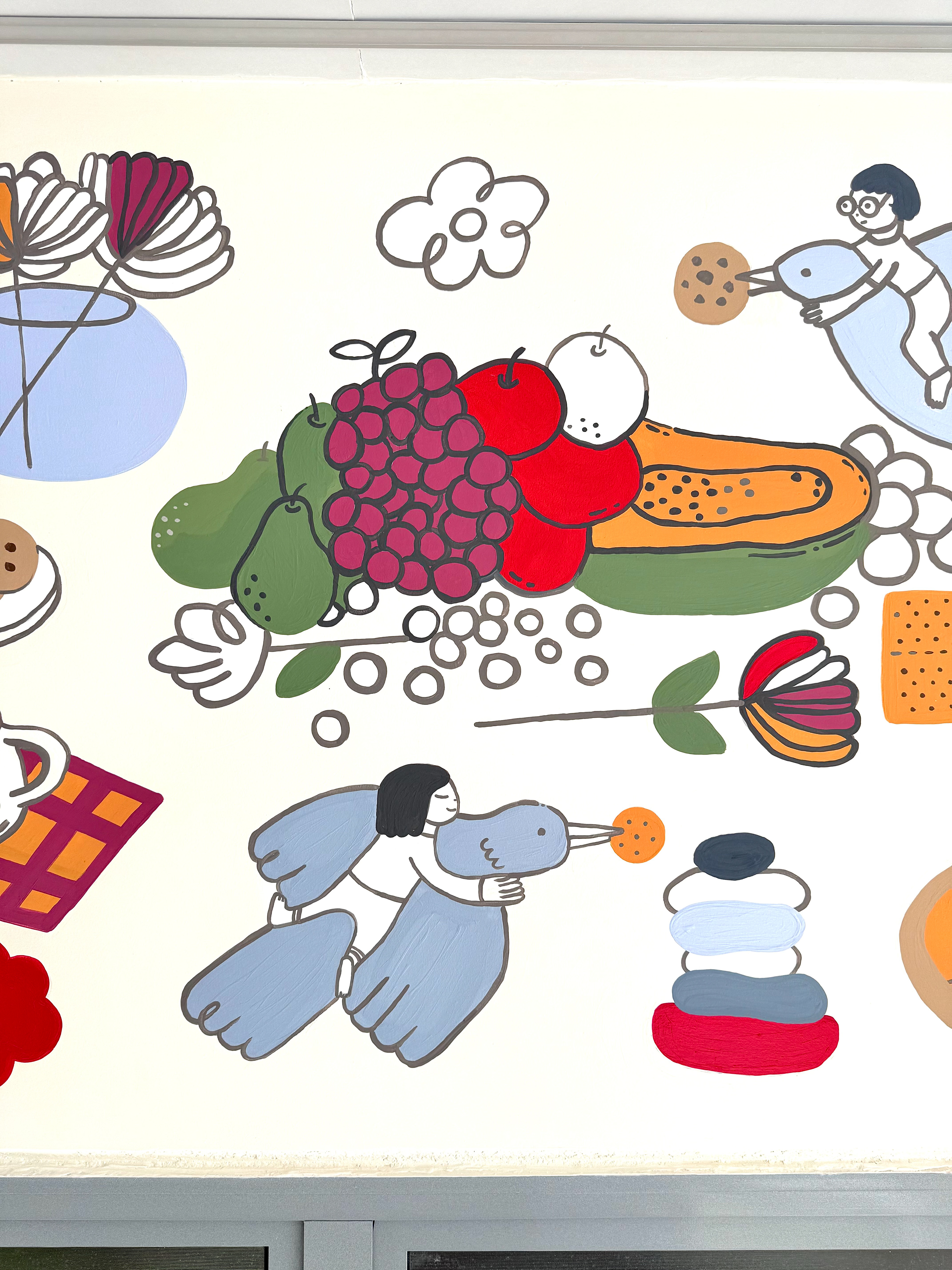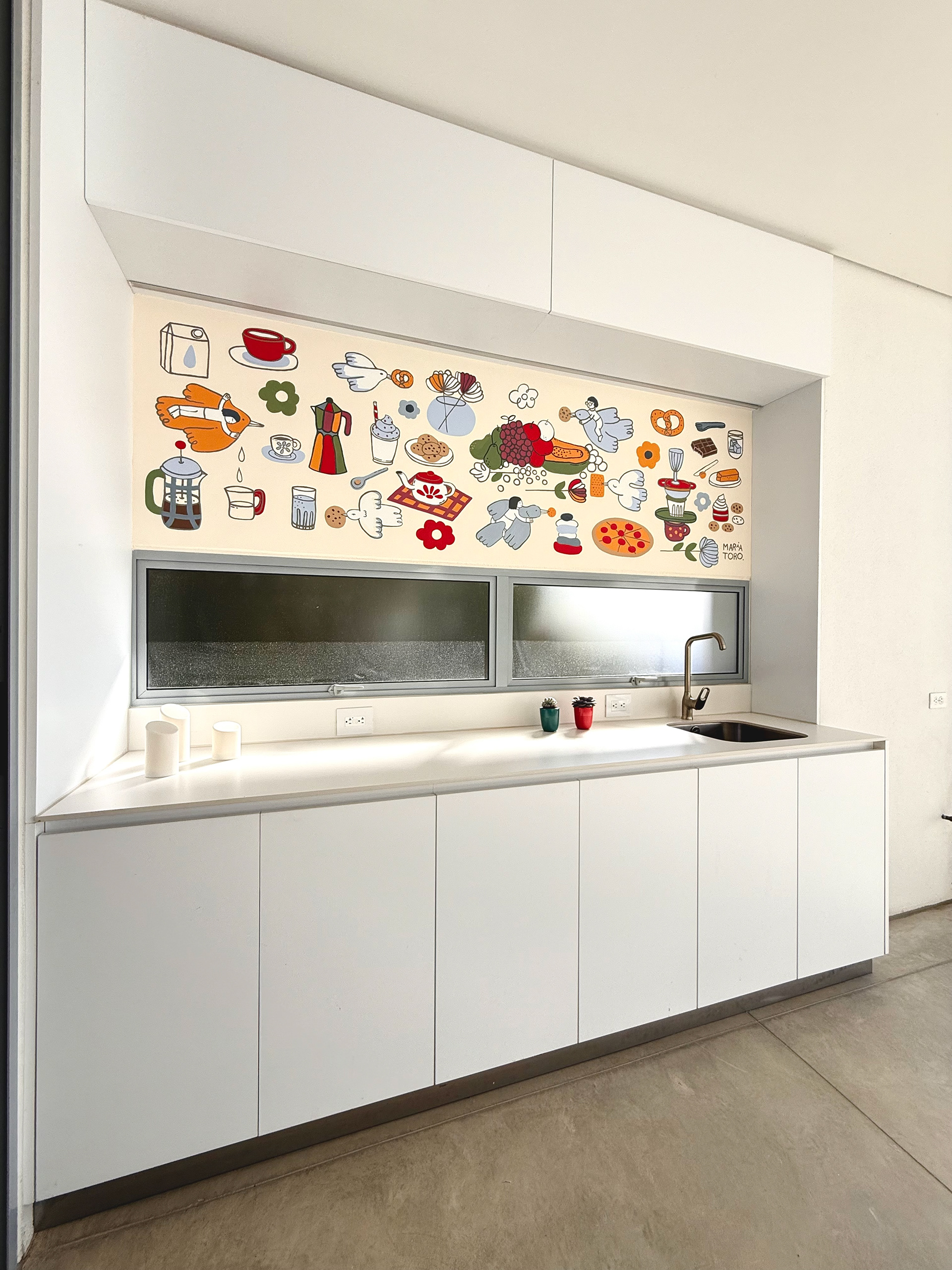 Colombian painter Beatriz Olano’s work is defined by her use of geometry, color, and line, exploring the relationship between objects and space with a distinctly architectural feel. Beatriz and I have shared a friendship and mutual admiration for several years. When she finished her studio, she invited me to be part of it and asked me to create a mural inspired by what she and her husband love most—their favorite moments, foods, and everyday joys. This project has been one of the most rewarding experiences of my life. Thank you, Beatriz!